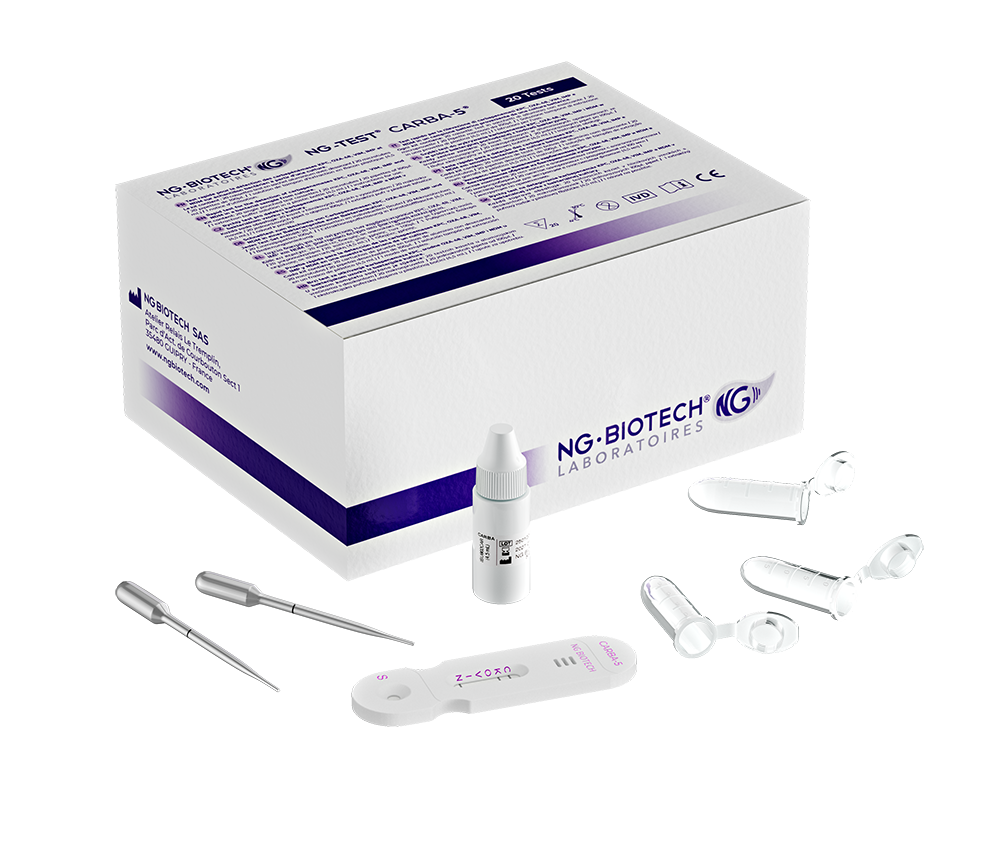 | NG-TEST® CARBA-5® | KPC, OXA-48-like, VIM, IMP, NDM | 20 cassettes, buffer, 20 microtubes, 20 pipettes | Lateral flow | NGB-CAR-S23-021 |