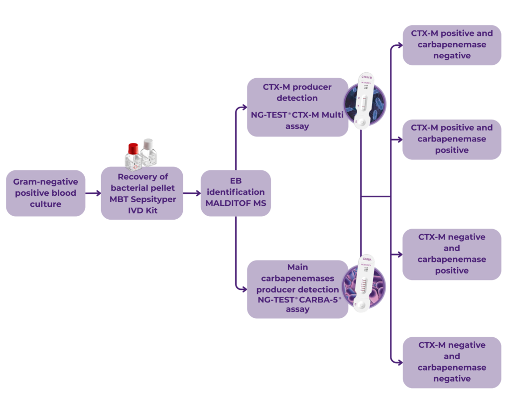 A recent study by Boattini et al. 2021 presented a fast-track diagnostics workflow for the detection of ESBL CTX-M and Carbapenemase producers directly from Enterobacterales Positive Blood Cultures followed by the implementation of the algorithm in their laboratory regular workflow.